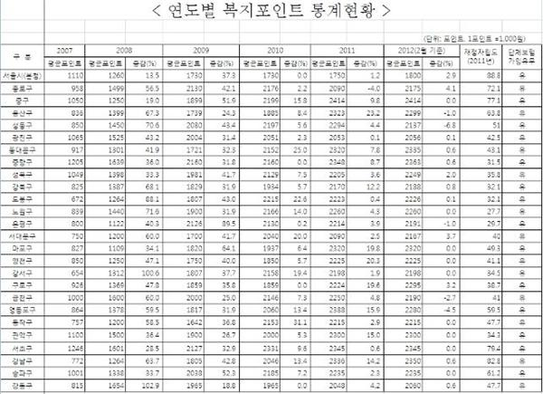 ¼¿ï½Ã°¡ ¼¿ï½ÃÀÇȸ °ø¼®È£ ÀÇ¿ø(¹ÎÁÖÅëÇÕ´ç, Áß¶û2)¿¡°Ô Á¦ÃâÇÑ¡®ÃÖ±Ù 5³â ¼¿ï½Ã ¹× °¢ ÀÚÄ¡±¸ º¹ÁöÆ÷ÀÎÆ® Áö±ÞÇöȲ¡¯¿¡ µû¸£¸é, º¹ÁöÆ÷ÀÎÆ®ÀÇ ¹èÁ¤±âÁØÀÌ ¼¿ï½Ã¿Í °¢ ÀÚÄ¡±¸°£ Â÷µîÀÌ Å©°í ¹èÁ¤±âÁصµ Á¦°¢°¢ÀÎ °ÍÀ¸·Î Á¶»çµÆ´Ù.
