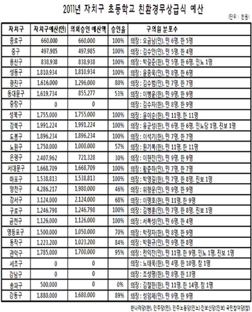 6ÀÏ ¼¿ï½Ã°¡ ¹ÎÁÖ´ç °ø¼®È£ ½ÃÀÇ¿ø(Áß¶û±¸ 2¼±°Å±¸)¿¡°Ô Á¦ÃâÇÑ ¡®¼¿ï½Ã ÀÚÄ¡±¸ 2011³â ÃʵîÇб³ ģȯ°æ¹«»ó±Þ½Ä ¿¹»ê(¾È)ÇöȲ¡¯ ÀÚ·á¿¡ ÀÇÇÏ¸é ¼¿ï½Ã±³À°Ã» 1,162¾ï 32¹é¸¸¿ø, 21°³ ÀÚÄ¡±¸ 284¾ï 60¹é¸¸¿øÀ» Æí¼ºÇß´Ù.