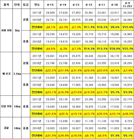 Áö³­ 1¿ù 25ÀÏ ±âÁØ »ç°ú ÈÄÁö 5kg ÁßǰÀº 14,965¿øÀ¸·Î Àü³â µ¿±â(19,255¿ø) ´ëºñ 22.3% Ç϶ôÇß°í, ¹è ½Å°í 7.5kg ÁßǰÀº 19,192¿øÀ¸·Î Àü³â µ¿±â(19,979¿ø)´ëºñ 3.9% Ç϶ôÇß´Ù. °¨±Ö ¶ÇÇÑ 10kg ÁßǰÀÌ 9,729¿øÀ¸·Î Àü³â µ¿±â(10,361¿ø) ´ëºñ 6.1% Ç϶ôÇϸ鼭 ¾ÈÁ¤¼¼¸¦ º¸À̰í ÀÖ´Ù.