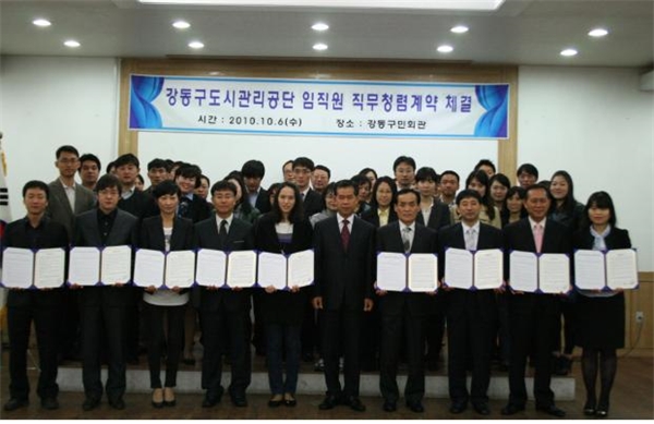°µ¿±¸µµ½Ã°ü¸®°ø´Ü(ÀÌ»çÀå À±ÇѽÄ)Àº Áö³11ÀÏ, ±¸¹Îȸ°ü¿¡¼ À±ÇÑ½Ä ÀÌ»çÀå°ú ÆÀÀåÀ» Æ÷ÇÔÇÑ ÀÓÁ÷¿ø 100¸í°ú Á÷¹«Ã»·Å°è¾àÀ» ü°áÇÏ¿´´Ù. Áö³ 5ÀÏ, ÀÌÁ¾ÀÏ ÀÌ»çȸÀÇÀå°ú ÀÌ»çÀå Á÷¹«Ã»·Å °è¾àÀ» ü°áÇѵ¥ À̾î, È®´ë ½Ç½ÃÇÑ °ÍÀ¸·Î °ø´ÜÀÇ ¹ÝºÎÆÐ û·ÅÀÇÁö¸¦ Ç¥¸íÇÏ¿´´Ù.