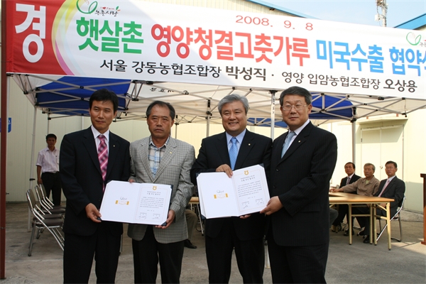 ¼¿ï°µ¿³óÇù Á¶ÇÕÀå(¹Ú¼ºÁ÷)Àº 8ÀÏ °æºÏ ¿µ¾ç±º ÀԾϳóÇù û°á°íÃå°¡·ç°¡°ø °øÀå¿¡¼ ¼¿ï³óÇù Çã¿ëÁߺ»ºÎÀå°ú °æºÏ³óÇù ±èº´È º»ºÎÀå, ±×¸®°í À¯°ü±â°ü, Á¶ÇÕ¿øµéÀÌ Âü¼®ÇÑ °¡¿îµ¥ ÀڸŰῬ³óÇùÀÎ ÀԾϳóÇù (Á¶ÇÕÀå ¿À»ó¿ë)°ú ÇÞ»ìÃ̰íÃå°¡·ç ¹Ì±¹ ¼öÃâÇù¾à½ÄÀ» °¡Á³´Ù. ¹Ì±¹ ÇÑÀμ¼Å¹¼ÒÇùȸ¿Í ¿¬°èÇÏ¿© óÀ½ ¼öÃâÀ» Çϴµ¥, 12ÀÏ Ã¹ 1t¼±ÀûÀ» ½ÃÀÛÀ¸·Î ¿¬°£ 20tÁ¤µµ(36¸¸ ´Þ·¯)¸¦ ¹Ì±¹À¸·Î ¼öÃâÇÏ°Ô µÈ´Ù. µµ³ó»ó»ýÀÇ ÁÁÀº º»º¸±â°¡ µÈ À̹ø Çù¾àÀº ¿µ¾ç°íÃßÀÇ ¿ì¼ö¼ºÀ» ¾Ë¸®°í ÇØ¿Ü½ÃÀå ÆÇ·ÎÈ®´ë¸¦ ÅëÇÑ °íÃßÀç¹è³ó°¡ÀÇ ¼ÒµæÁõ´ë¸¦ µµ¸ðÇϱâ À§ÇØ ÃßÁøµÇ¾úÀ¸¸ç, ³óÇùÀÇ À̹ÌÁö Á¦°í ¹× Çѱ¹À» ³Î¸® ¾Ë¸°´Ù´Â Å« Àǹ̸¦ °®´Â °ÍÀ¸·Î ¾Ë·ÁÁ³´Ù.¹Ú¼ºÁ÷ Á¶ÇÕÀåÀº ¡°¿À·£ ³ë·ÂÀÌ °á½ÇÀ» ¸Î¾î ¿ì¸® °íÃå°¡·ç°¡ ¹Ì±¹ Àü¿ª¿¡ °ø±ÞµÇ°í ÁÁÀº È£ÀÀÀ» ¾ò¾î Áö¼ÓÀûÀ¸·Î ¸¹Àº ¹°·®ÀÌ ¼öÃâµÇ±â À§Çؼ´Â ¾ÕÀ¸·Î ´õ¿í´õ °íǰÁúÀÇ »ý»ê¿¡ ÁÖ·ÂÇØ °æÀï·ÂÀ» ³ô¿©¾ß ÇÒ °ÍÀ̸ç, ³ó»ê¹° ¼öÃâ±¹ ´Ùº¯È ¹× ½Å±Ô ÇØ¿Ü½ÃÀåÀ» °³Ã´ÇÏ´Â °ÍÀÌ ÆÇ¸Å¿¡ ¾î·Á¿òÀ» °Þ°í ÀÖ´Â ¿ì¸® ³ó¾÷ÀÌ ³ª¾Æ°¥ ±æÀ̶ó »ý°¢µÈ´Ù¡±°í ¸»Çß´Ù.