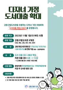 °­µ¿¹®È­Àç´Ü(ÀÌ»çÀå À̼öÈñ) ¼Ò¼Ó °­µ¿±¸¸³µµ¼­°üÀº 11¿ù 1ÀϺÎÅÍ ´ÙÀÚ³à °¡Á¤À» À§ÇÑ µµ¼­´ëÃâ ¼­ºñ½º¸¦ ½Å¼³Çß´Ù°í ¹àÇû´Ù. °­µ¿±¸¸³µµ¼­°üÀº ÃÑ 6°³°ü(¼º³»...