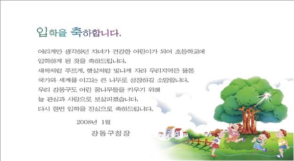 °µ¿±¸(±¸Ã»Àå±ÇÇÑ´ëÇà ÃÖ¿ëÈ£)´Â 2008³â ÃʵîÇб³ ÀÔÇÐÀ» ¾ÕµÐ ¾î¸°À̵鿡°Ô º¸³¾ ¿¹»Û ÃàÇÏ Ä«µå¸¦ Á¦ÀÛÇÏ¿© ÃëÇÐ Àڳడ ÀÖ´Â °¡Á¤¿¡ Àü´ÞÇϰí ÀÖ´Ù.