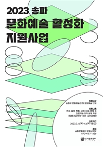 (Àç)¼ÛÆÄ¹®È­Àç´Ü (´ëÇ¥ÀÌ»ç À̵¿±Ù)Àº ¼ÛÆÄ±¸ ¹®È­¿¹¼úÀÎ ¹× ¹®È­¿¹¼ú ´Üü¸¦ ´ë»óÀ¸·Î ¡®2023 ¼ÛÆÄ ¹®È­¿¹¼ú Ȱ¼ºÈ­ Áö¿ø»ç¾÷¡¯À» ½Ç½ÃÇÑ´Ù. º» »ç¾÷Àº ¼Û...