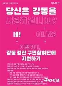 °µ¿±¸(±¸Ã»Àå À̼öÈñ)°¡ 9¿ù 30ÀϱîÁö '°µ¿ °æ°ü ±¸¹Î Âü¿©´Ü'À» °ø°³ ¸ðÁýÇÑ´Ù. °µ¿±¸¸¦ »ç¶ûÇÏ´Â ÁÖ¹ÎÀ̶ó¸é ´©±¸³ª ½ÅûÇÒ ¼ö ÀÖ°í, Âü¿©´ÜÀ¸·Î ¼±Á¤...
