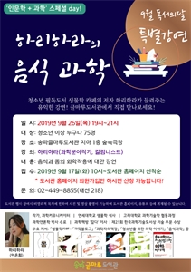 ¼ÛÆÄ±¸½Ã¼³°ü¸®°ø´Ü(ÀÌ»çÀå ¹Ú¿ë¸ð) ¼Ò¼Ó ¼ÛÆÄ±Û¸¶·çµµ¼­°ü¿¡¼­´Â 9¿ù µ¶¼­ÀÇ ´ÞÀ» ¸Â¾Æ Ưº° °­¿¬ <Çϸ®Ç϶óÀÇ À½½Ä°úÇÐ>À» ÁøÇàÇÑ´Ù.¼ÛÆÄ±Û¸¶·çµµ¼­°ü...