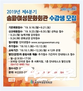 ¼ÛÆÄ±¸½Ã¼³°ü¸®°ø´Ü(ÀÌ»çÀå ¹Ú¿ë¸ð)¿¡¼­´Â 9¿ù 9ÀÏ(È­) ¿ÀÈÄ 2½ÃºÎÅÍ 1½Ã°£ µ¿¾È ¼ÛÆÄ¿©¼º¹®È­È¸°ü, ¼ÛÆÄ½Ã´Ï¾îŬ·´, Èñ³ª¸®µ¥ÀÌÄɾÅÍ, ¼ÛÆÄ½Ç¹þ¶ß¶ô, ±¸¸³...