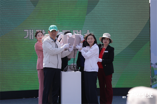 29ÀÏ °³Åë½Ä ÇöÀå¿¡¼­´Â ´ÜÀýµÇ¾ú´ø ¿ª»ç ¹®È­¿Í ÀÚ¿¬È¯°æ, ÇѰ­ µîÀ» »ó¡ÇÏ´Â °Å´ëÇÑ ºø»ì¹«´Ì Åä±âÀÇ Á¶°¢À» ÀÌ¾î ºÙÀÌ´Â ÆÛÆ÷¸Õ½º°¡ ÁøÇàµÆ´Ù. Èð¾îÁ³´ø Á¶°¢ÀÌ ´Ù½Ã ¸ðÀ̸鼭 ºø»ì¹«´Ì Åä±â°¡ ¿Ï¼ºµÇÀÚ, ºû°ú ÇÔ²² ¹«´ë µÚ ½ºÅ©¸°ÀÌ ¿­¸®¸é¼­ ÇѰ­À» ÇâÇØ »¸Àº ¾Ï»çÃʷϱæÀÌ ¸ð½ÀÀ» µå·¯³» ÁֹεéÀÇ ¹Ú¼ö¿Í ȯȣ°¡ ÅÍÁ®³ª¿Ô´Ù. Çà»ç¿¡ Âü¿©ÇÑ ÁֹεéÀº ¾Ï»çÃʷϱ濡¼­ ÇѰ­°ú ¸Â´êÀº ¾Ï»ç »ýŰø¿øÀÇ Àü¸Á´ë±îÁö °ÉÀ¸¸ç ÇÔ²² »çÁøÀ» Âï´Â µî °³Åë ÇöÀåÀ» ÀÚÀ¯·Ó°Ô ±â³äÇß´Ù.