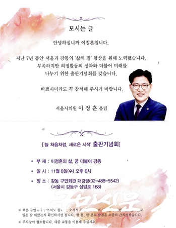 [±¸¹Î½Å¹® ±Ç°æÈ£ ±âÀÚ]ÀÌÁ¤ÈÆ ½ÃÀÇ¿ø(°µ¿±¸1)ÀÌ 11¿ù8ÀÏ ¿ÀÈÄ6½Ã °µ¿±¸¹Îȸ°ü ´ë°´ç¿¡¼ [´Ã óÀ½Ã³·³, »õ·Î¿î ½ÃÀÛ]ÃâÆÇ±â³äȸ¸¦ °®´Â´Ù.