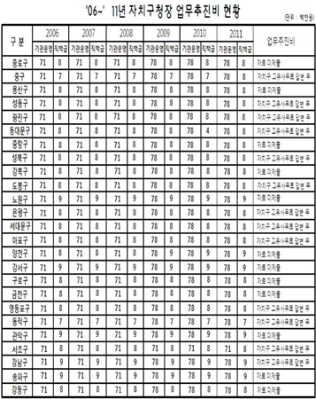 ´õ¿íÀÌ 2011³â ¼¿ï½Ã 25°³ ÀÚÄ¡±¸ ±¸Ã»ÀåµéÀº ÀϰýÀûÀ¸·Î ¾÷¹«ÃßÁøºñ 8,600¸¸¿ø(±â°ü¿î¿µ 7,800¸¸¿ø, Á÷Ã¥±Þ 800¸¸¿ø)À» Æí¼ºÇØ ÁֹεéÀÇ µû°¡¿î ´«ÃÑÀ» ÇÇÇϱ⠾î·Á¿ï °ÍÀ¸·Î º¸ÀδÙ.