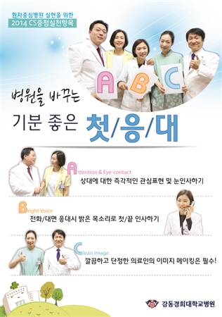 °µ¿°æÈñ´ëÇб³º´¿øÀº ¡®ÇູÇÑ °æÇèÀ» µå¸®´Â º´¿ø¡¯À̶ó´Â CSºñÀü ¾Æ·¡ Áö¼ÓÀûÀ̰í Ȱ¹ßÇÑ °í°´¸¸Á·È°µ¿À» ¹ú¿©¿Ô´Ù. À̳¯ º´¿øÀº ¹à°í Àû±ØÀûÀΠù ÀÀ´ë·Î °í°´¿¡°Ô ´Ù°¡°¡°Ú´Ù´Â ÀÇÁö¸¦ ´ã¾Æ ¡®º´¿øÀ» ¹Ù²Ù´Â ù ÀÀ´ë ABC¡¯¸¦ 2014³âµµ ÁßÁ¡½ÇõÇ׸ñÀ¸·Î ¼±Æ÷Çß´Ù.