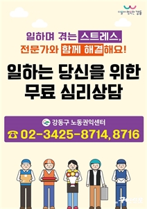 °­µ¿±¸(±¸Ã»Àå ÀÌÁ¤ÈÆ)°¡ ³ëµ¿ÀÚ¸¦ ´ë»óÀ¸·Î ¹«·á ½É¸®»ó´ã ÇÁ·Î±×·¥À» ÁøÇàÇÑ´Ù. °­µ¿±¸ ³ëµ¿±ÇÀͼ¾ÅÍ¿¡¼­´Â Áö³­ 2019³âºÎÅÍ ¸ö°ú ¸¶À½ÀÌ ÁöÄ£ ³ëµ¿ÀÚ¸¦ À§ÇÑ...