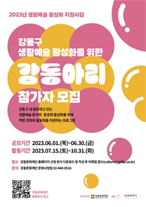 °­µ¿¹®È­Àç´Ü(À̼öÈñ ÀÌ»çÀå)ÀÌ 6¿ù 30ÀϱîÁö °­µ¿±¸ »ýȰ¿¹¼ú Ȱ¼ºÈ­¸¦ À§ÇÑ ¡®°­-µ¿¾Æ¸®¡¯ Âü°¡ÀÚ¸¦ ¸ðÁýÇÑ´Ù. ¡®°­-µ¿¾Æ¸®¡¯´Â ¼­¿ï¹®È­Àç´ÜÀÇ ÈÄ¿øÀ¸·Î ÁøÇà...